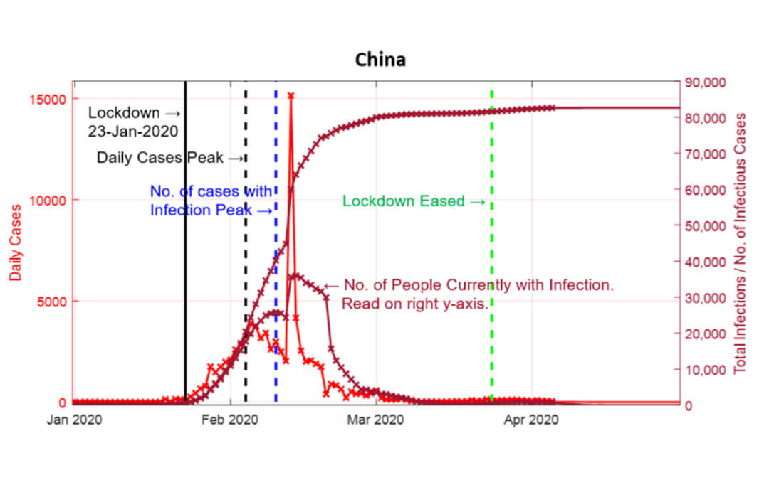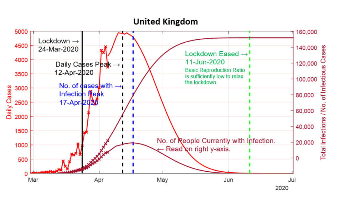 The number of infectious cases (number of people with infection) will peak on 17 April 2020. The government’s plan of easing down the lockdown measures on Easter are not likely to materialise. It would be rather risky strategy and too soon to ease down the lockdown anytime in April or early May. If the UK follows China’s strategy, the lockdown could potentially be eased during the last week of June, when the number of people with infection and the Reproduction Ratio is sufficiently low.