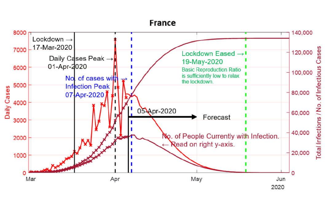 We expect the number of daily new cases to start declining now. The number of infectious cases and Reproduction Ratio will be low enough to ease lockdown on 19 May 2020.
