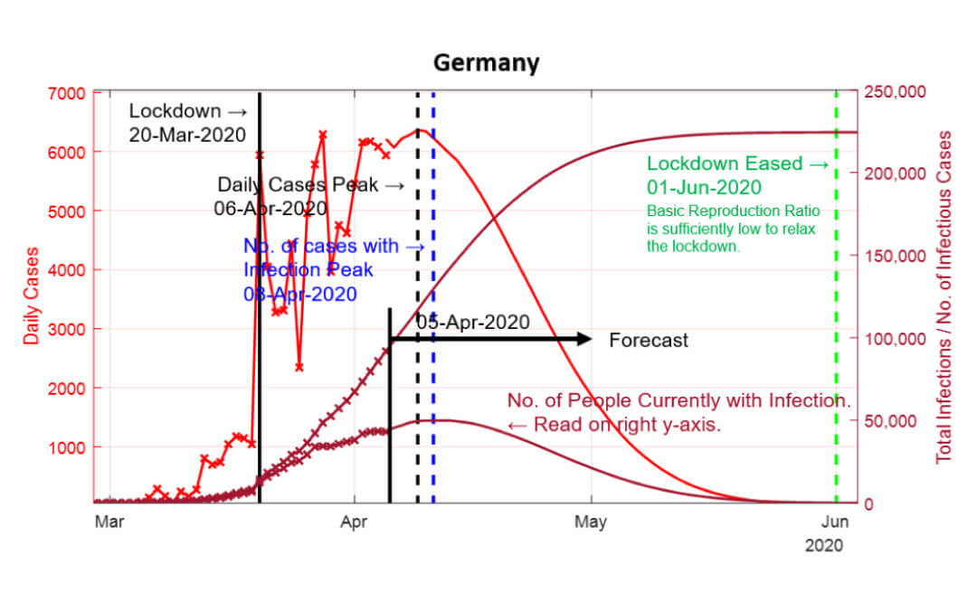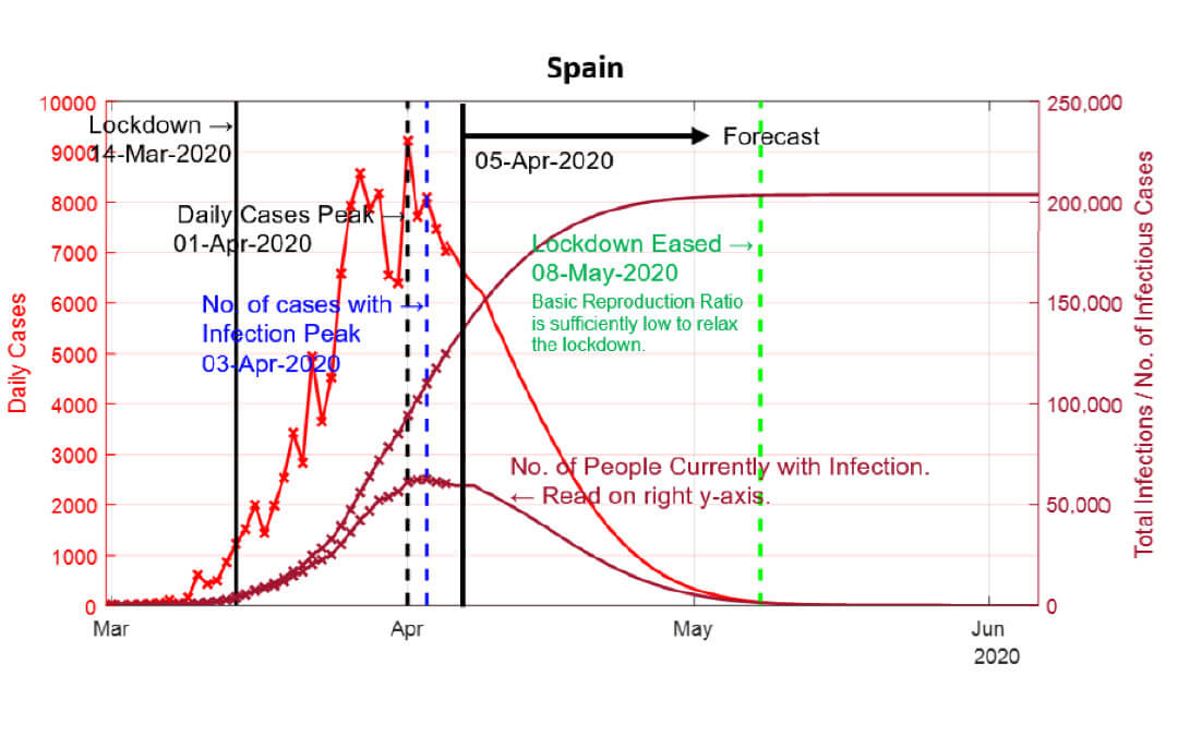 A similar analysis for Spain. The number of daily new cases will continue to decline provided that the lockdown measured are continued to be implemented and followed. The number of infections cases and Reproduction Ratio will be low enough to ease lockdown on 08 May 2020.